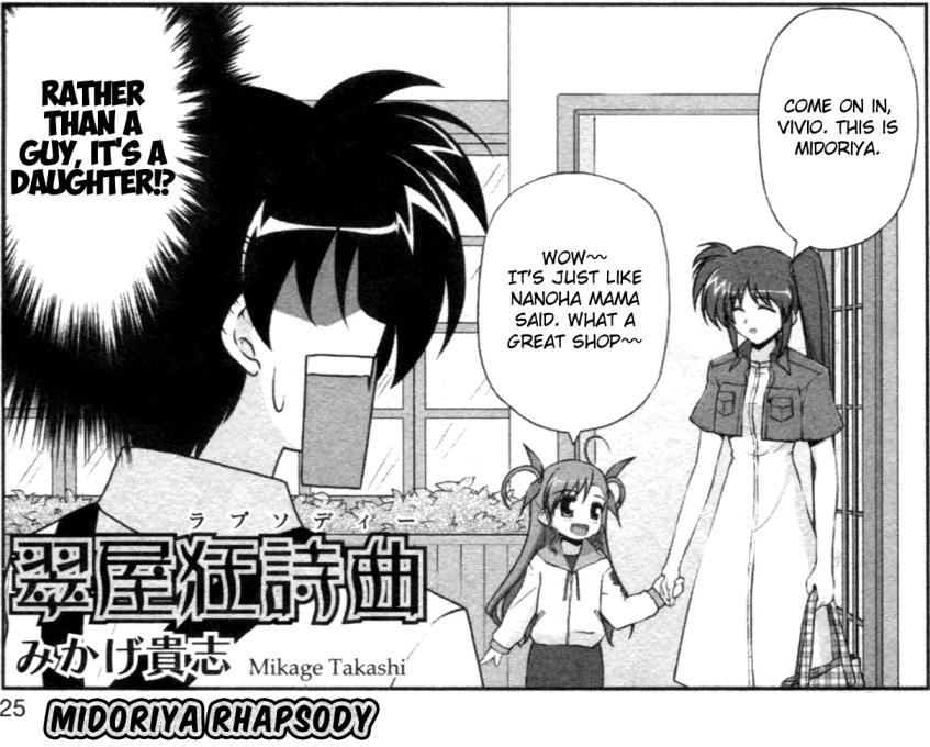Nanoha takes Vivio back to Earth to visit her family.Β Shirou is freaking out. Momoko teases him to high heaven. Feito-mama makes her appearance and Divine Busters are shot faster than you can blink. Why does this seem so familiar? We’ve seen this before…. but not like this. Many thanks to the beautiful work of our anonymous collaborator.